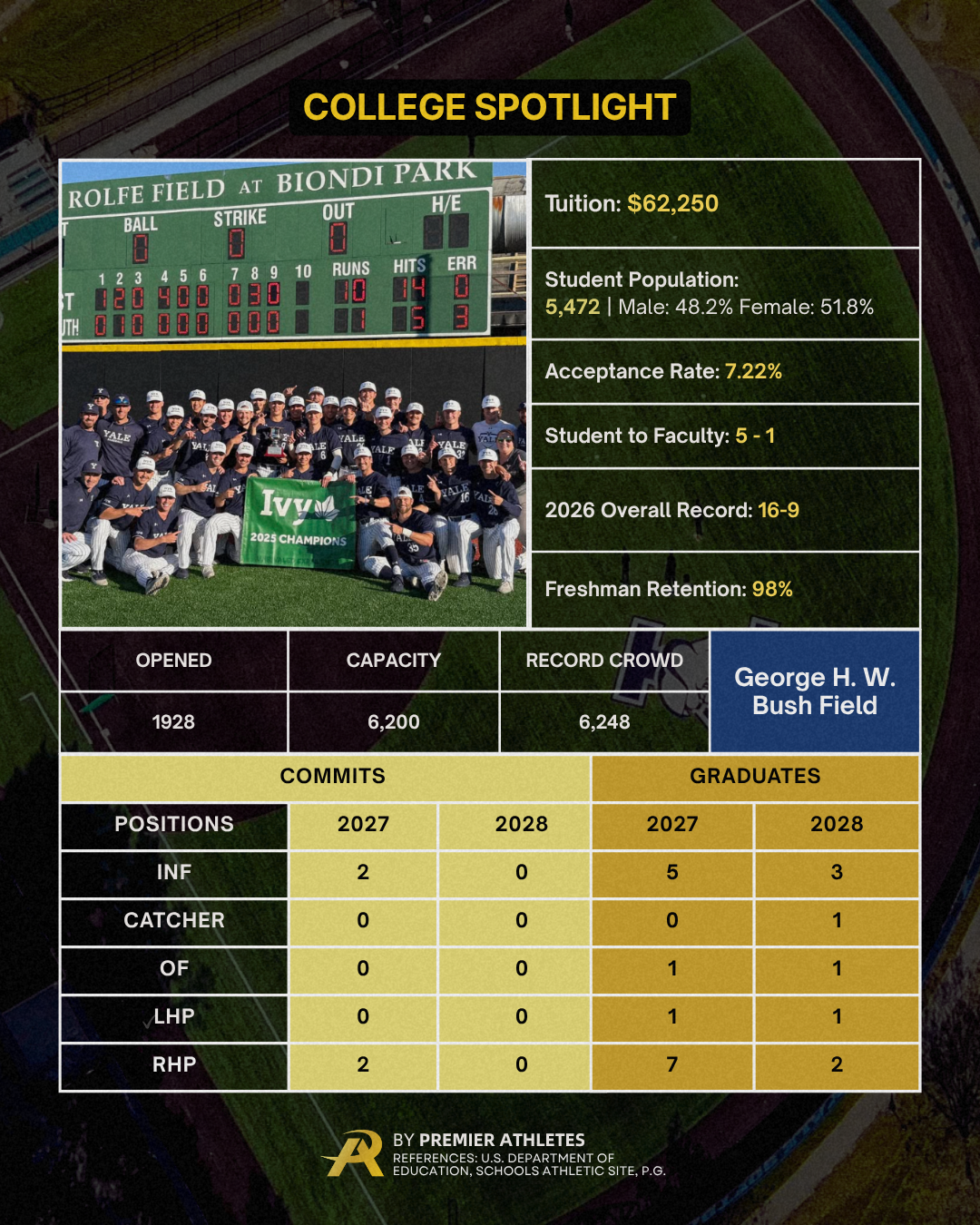 Home Field: George H.W. Bush '48 Field — named after a guy who played first base here before becoming the 41st President of the United States